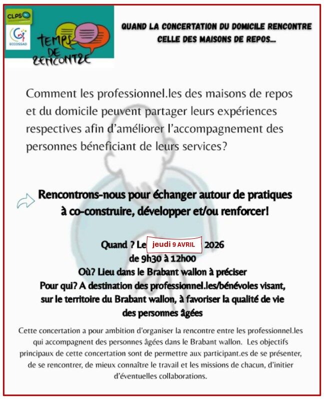 Lors de cette première concertation de l’année, il s’agit d’inviter les acteur·ices travaillant en Maison de Repos et de Soins (MRS) afin d’échanger autour de pratiques à co-construire, développer et/ou renforcer entre les secteurs du domicile et des MRS.