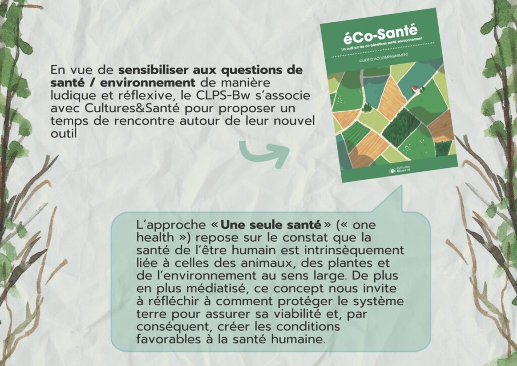 Ce temps de rencontre s’adresse aux acteurs et actrices social-santé (au sens large) qui souhaitent initier ou approfondir une réflexion autour des liens entre santé et environnement pour eux et elles-mêmes ou avec leurs bénéficiaires.